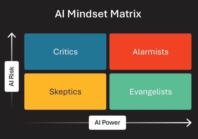 A matrix can be a good visual tool to navigate the chaos. On one axis: how powerful someone thinks AI will be (meh to life altering). On the other: how risky they believe it is (benign to catastrophic).