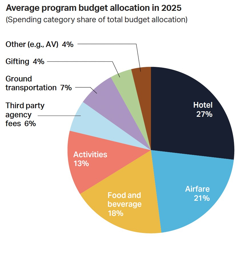 The majority of incentive travel budgets go toward hotel, travel and food — cumulatively accounting for 66% of total spend.